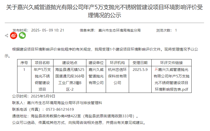 2025年5月9日, 嘉興市生態(tài)環(huán)境局海鹽分局受理嘉興久威管道拋光有限公司年產(chǎn)5萬支拋光不銹鋼管建設(shè)項(xiàng)目環(huán)境影響評價(jià)文件并對外進(jìn)行公示。