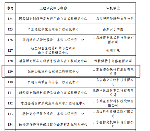 7月8日,山東省發(fā)展和改革委員會發(fā)布了《關(guān)于公布2024年認定山東省工程研究中心名單的通知》,山東盛陽金屬科技股份有限公司申報的“先進金屬材料山東省工程研究中心”成功獲批。