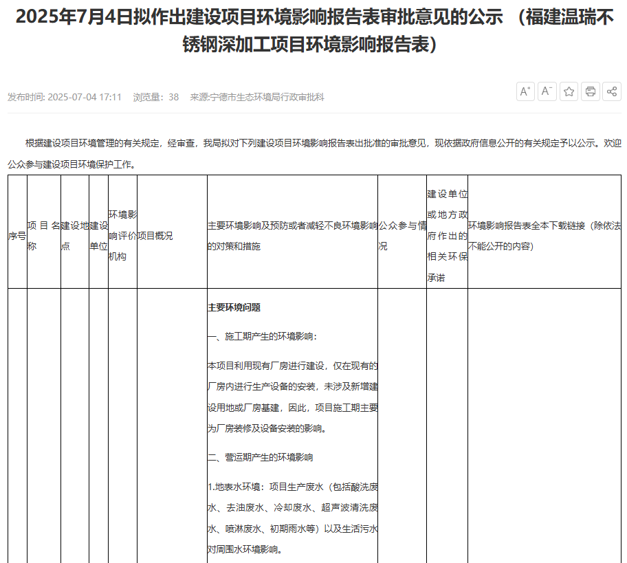 2025年7月4日,寧德市生態(tài)環(huán)境局就福建溫瑞管業(yè)科技有限公司不銹鋼深加工項(xiàng)目環(huán)境影響報(bào)告表作出審批意見并對(duì)外進(jìn)行公示,公示時(shí)間:2025年7月4日-2025年7月11日(5個(gè)工作日)。