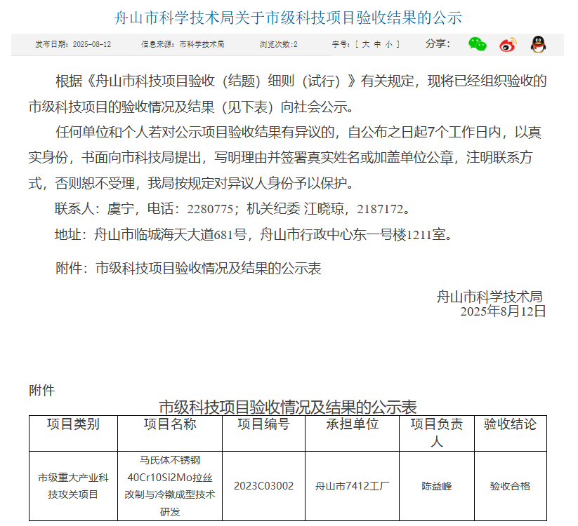 2025年8月12日,舟山市科學(xué)技術(shù)局將市級(jí)科技項(xiàng)目驗(yàn)收結(jié)果對(duì)外進(jìn)行公示,公示期:7個(gè)工作日。
