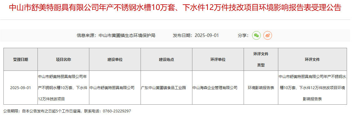 2025年9月1日,中山市黃圃鎮(zhèn)生態(tài)環(huán)境保護(hù)局受理中山市舒美特廚具有限公司年產(chǎn)不銹鋼水槽10萬套、下水件12萬件技改項(xiàng)目環(huán)境影響報告表并對外進(jìn)行公告,公告期:5個工作日。